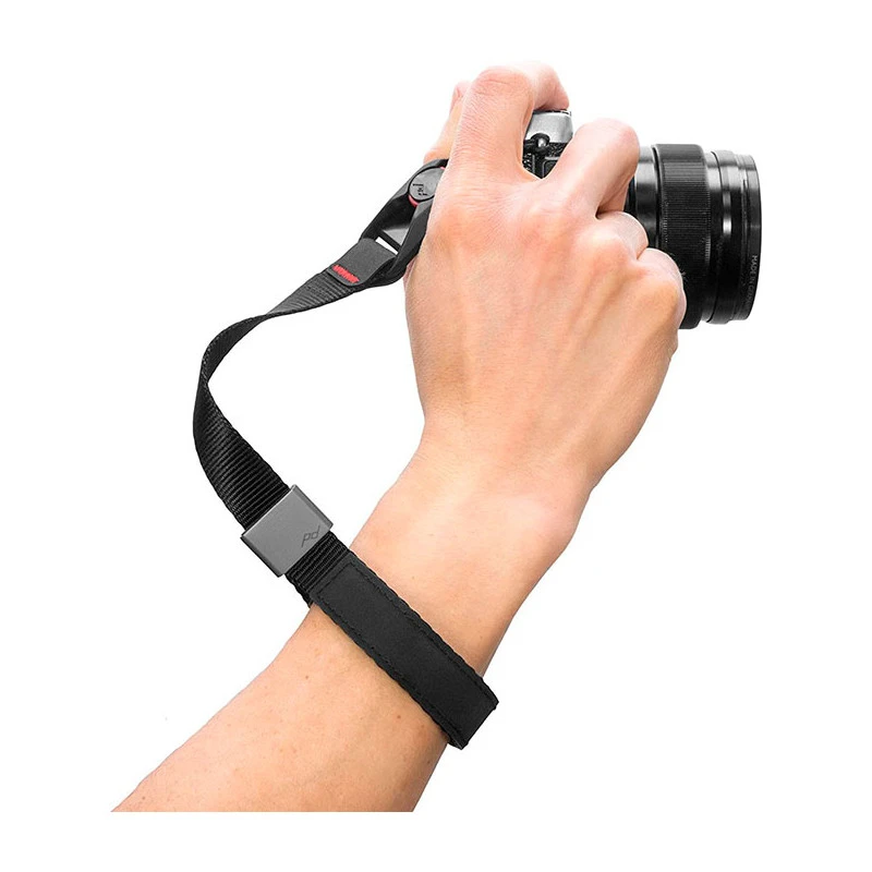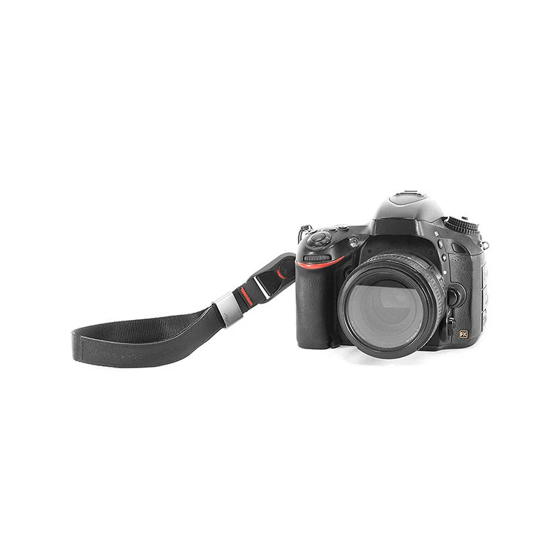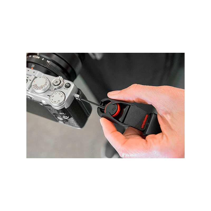 Una característica especial es el sistema de fijación. El sistema se compone de un cierre de ranura en la propia correa y una correa de ancla estable para agarrar en la cámara.
