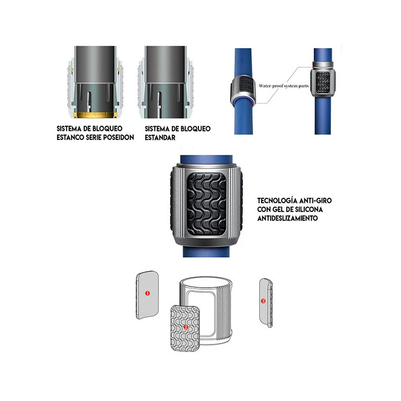Los cierres de rosca de las patas poseen un nuevo diseño estanco para minimizar cualquier entrada de agua, arena o polvo. Evitando tener que realizar un mantenimiento continuo. Incluyen un diseño en gel de silicona para mejorar el agarre incluso con agua.