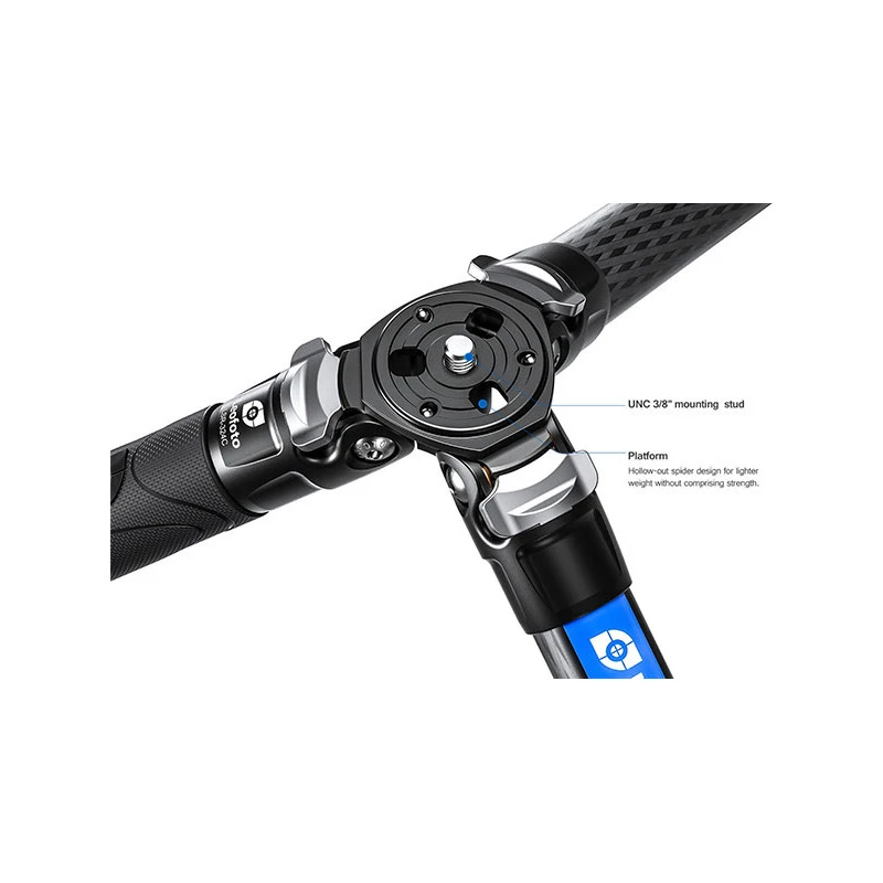Cada una de las secciones del trípode tiene movimiento independiente y bloqueo en tres posiciones (23º / 55 º / 85º) determinadas con posibilidad de fotografiar a ras de suelo.