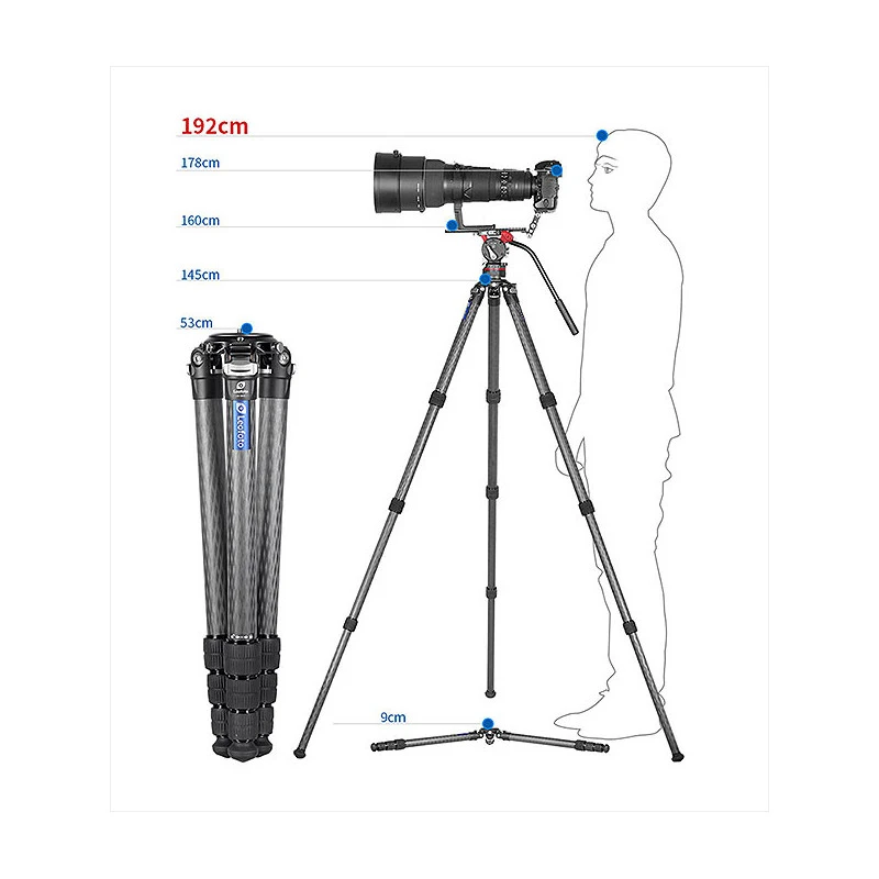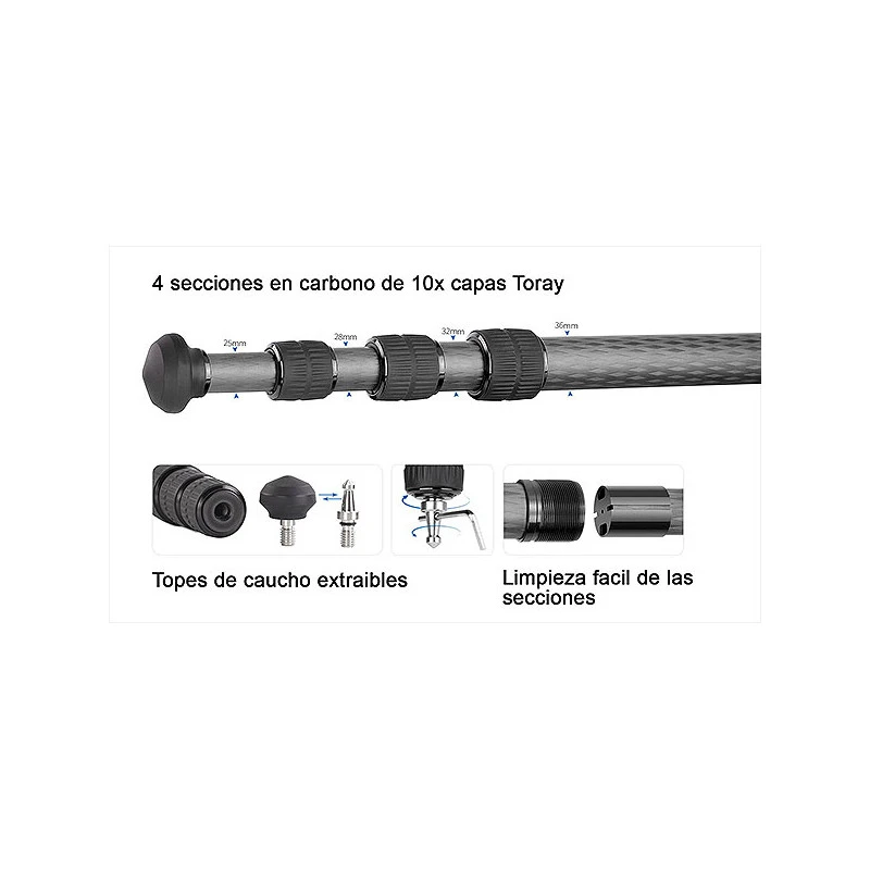 Realizado en carbono 10 capas Toray con patas bloqueables en ángulos independientes.
