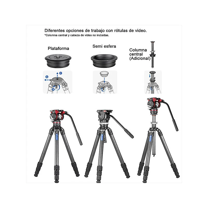 Sin columna central con plato base extraíble con tornillo de 3/8 y base semi esfera de 75mm incluida para grabación con cámaras de video.