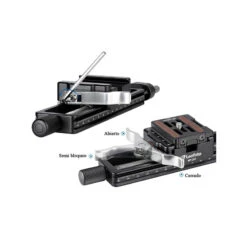 La parte superior de la zapata rápida tiene una palanca de bloqueo y apertura de forma rápida y segura. Permite acoplarle platos extraíbles con montura compatible Arca.