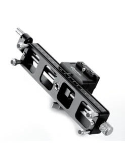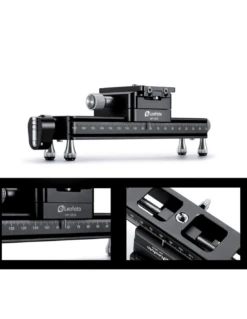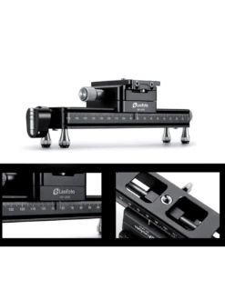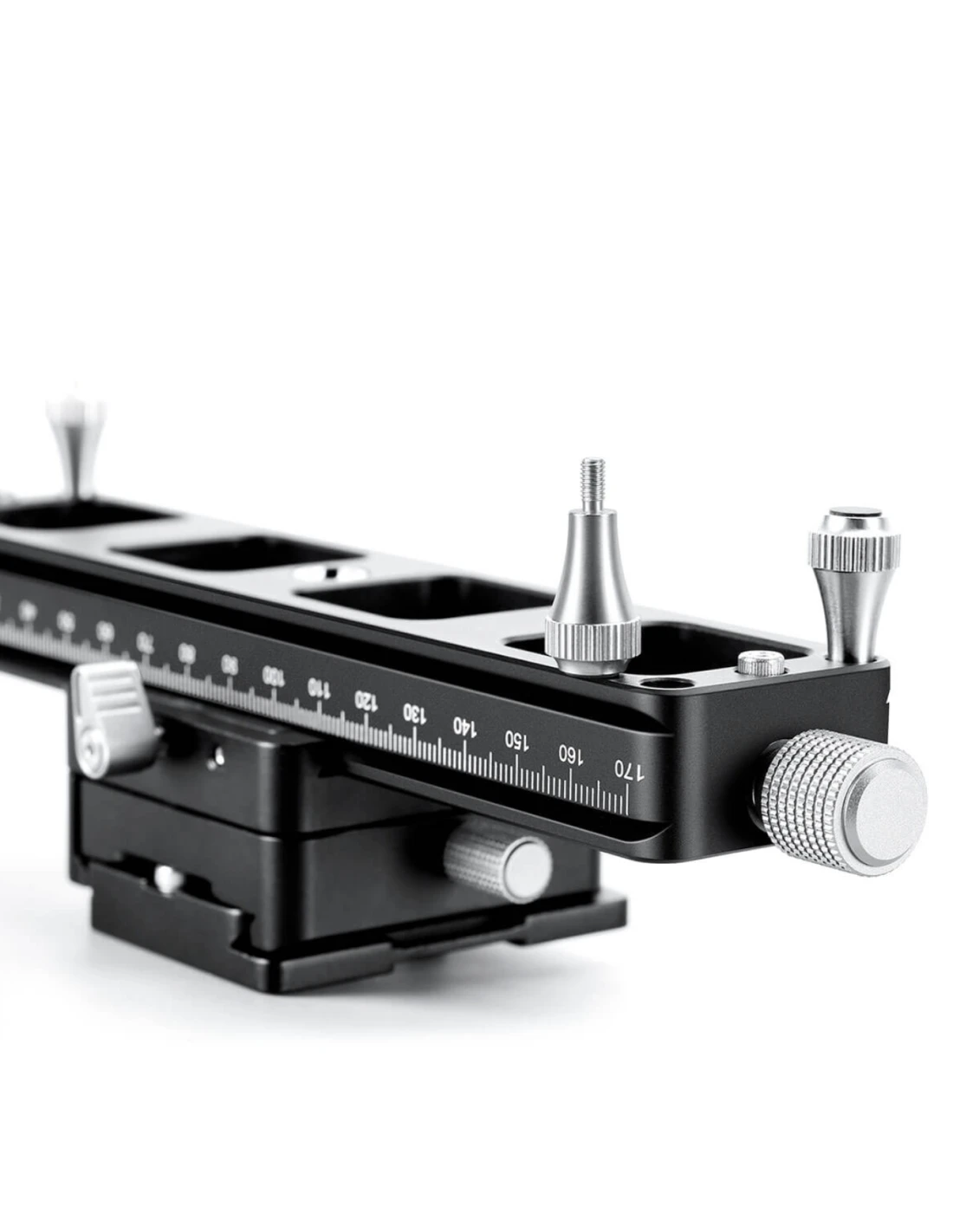 El rail esta realizado en aluminio aeronáutico con maquinaria CNC aligerado, dispone de una longitud operativa de 220 mm con indicadores milimétricos grabados con láser a lo largo del rail. El propio rail es compatible con rótulas de bola Leofoto y similares con anclaje Arca Swiss / Kirk.