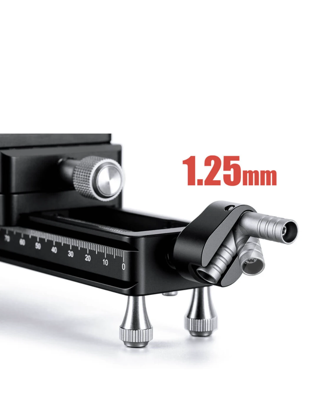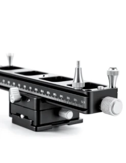 Uno de los extremos del rail dispone de una manivela con pomo extraíble de 20 mm para giro preciso sobre la cámara con recorrido de 1.25mm. En el otro extremo un pomo fijo a rosca también proporciona precisión de movimientos.