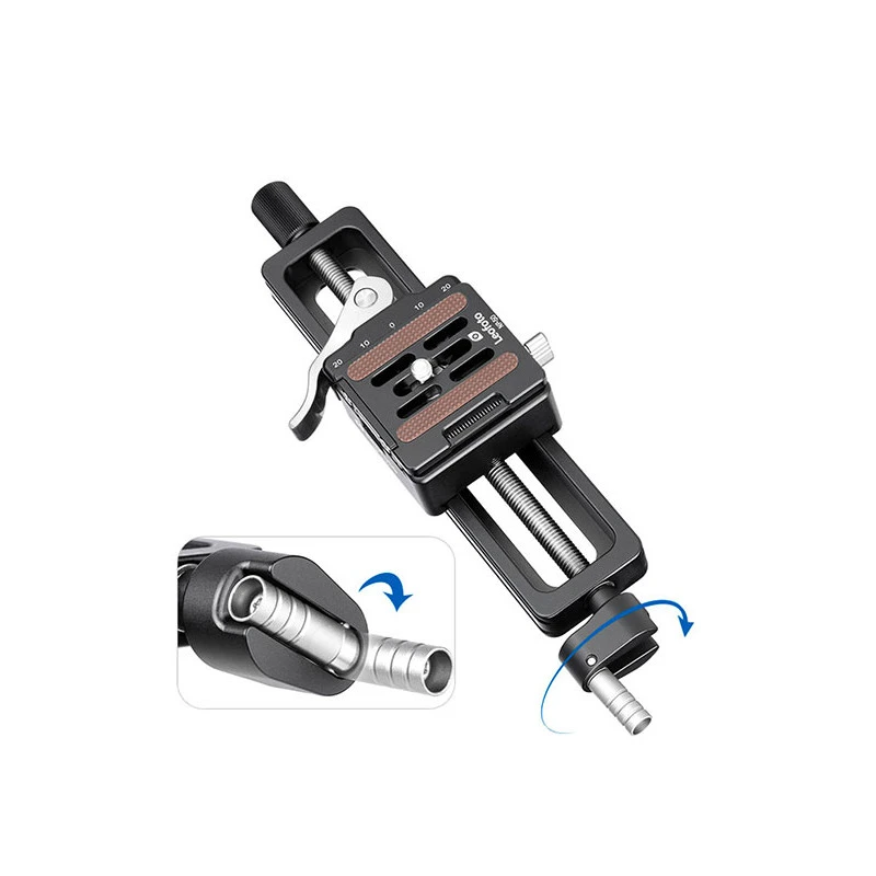 La parte superior de la zapata se puede girar 360º y bloquearse con su tornillo lateral dedicado. Permite acoplarle platos extraíbles con montura compatible Arca.